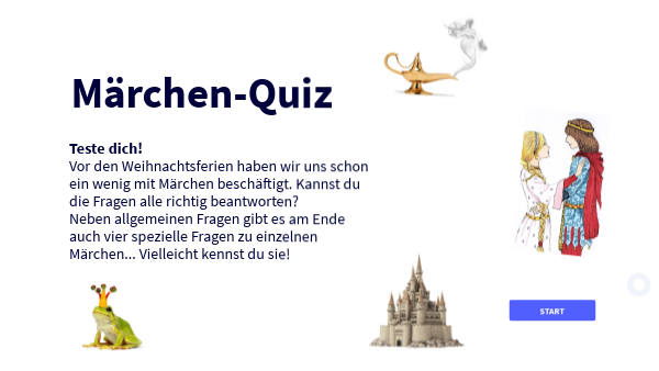 Teste dich! Vor den Weihnachtsferien haben wir uns schon ein wenig mit Märchen beschäftigt. Kannst du die Fragen alle richtig beantworten? Neben allgemeinen Fragen gibt es am Ende auch vier spezielle Fragen zu einzelnen Märchen... Vielleicht kennst du sie!