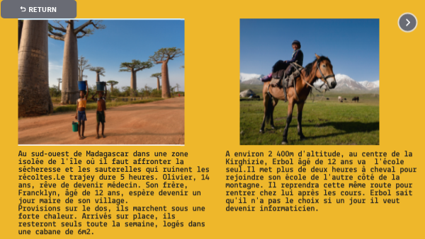 Au sud-ouest de Madagascar dans une zone isolée de l'île où il faut affronter la sécheresse et les sauterelles qui ruinent les récoltes.Le trajey dure 5 heures. Olivier, 14 ans, rêve de devenir médecin. Son frère, Francklyn, âgé de 12 ans, espère devenir un jour maire de son village.Provisions sur le dos, ils marchent sous une forte chaleur. Arrivés sur place, ils resteront seuls toute la semaine, logés dans une cabane de 6m2.