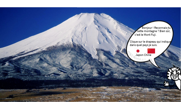Bonjour ! Reconnais-tu cette montagne ? Bien sûr, c'est le Mont Fuji. Clique sur le drapeau qui indique dans quel pays je suis.
