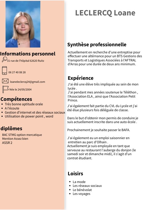 J'ai également fait partie du CVL du Lycée et j'ai été élue plusieurs fois déléguée de classe. Dans le but d'obtenir mon permis de conduire je suis actuellement inscrite dans une auto école . Prochainement je souhaite passer le BAFA. J'ai également eu un emploi saisonnier en entretien au parc d'Olhain . Actuellement je suis employée en tant que serveuse au restaurant l'auberge du donjon (le samedi soir et dimanche midi), il s'agit d'un contrat étudiant.