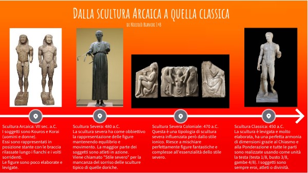 Scultura Classica: 450 a.C. La scultura è levigata e molto elaborata, ha una perfetta armonia di dimensioni grazie al Chiasmo e alla Ponderazione e tutte le parti sono realizzate usando come unità la testa (testa 1/8, busto 3/8, gambe 4/8). I soggetti sono sempre eroi, atleti o divinità.