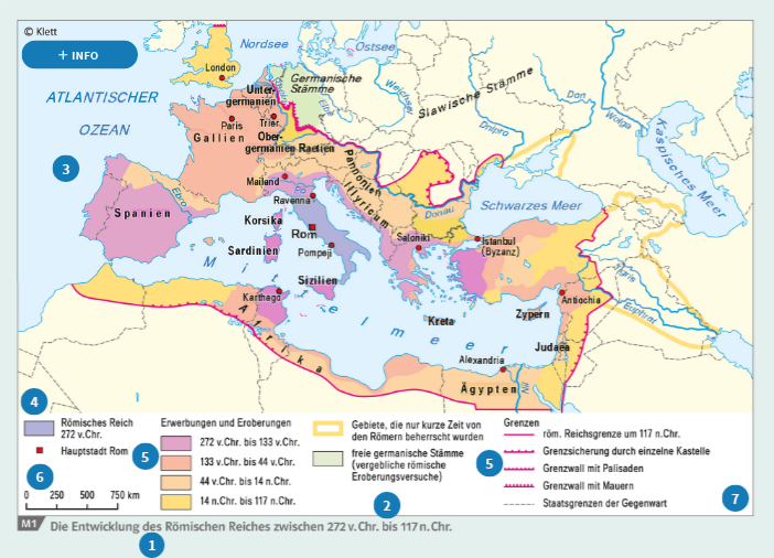 Am Beispiel der Entwicklung des Römischen Reiches werden die einzelnen Schritte zur Analyse einer Geschichtskarte visualisiert.