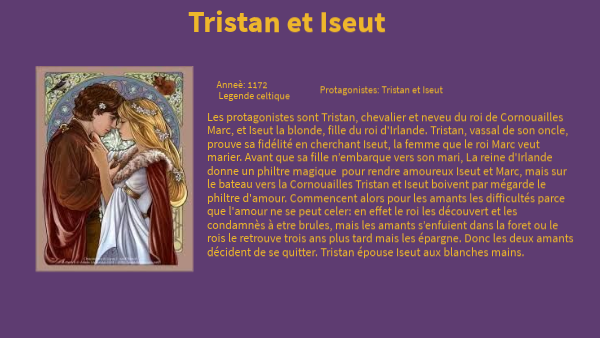 Les protagonistes sont Tristan, chevalier et neveu du roi de Cornouailles Marc, et Iseut la blonde, fille du roi d'Irlande. Tristan, vassal de son oncle, prouve sa fidélité en cherchant Iseut, la femme que le roi Marc veut marier. Avant que sa fille n’embarque vers son mari, La reine d'Irlande donne un philtre magique pour rendre amoureux Iseut et Marc, mais sur le bateau vers la Cornouailles Tristan et Iseut boivent par mégarde le philtre d'amour. Commencent alors pour les amants les difficultés parce que l'amour ne se peut celer: en effet le roi les découvert et les condamnès à etre brules, mais les amants s’enfuient dans la foret ou le rois le retrouve trois ans plus tard mais les épargne. Donc les deux amants décident de se quitter. Tristan épouse Iseut aux blanches mains.