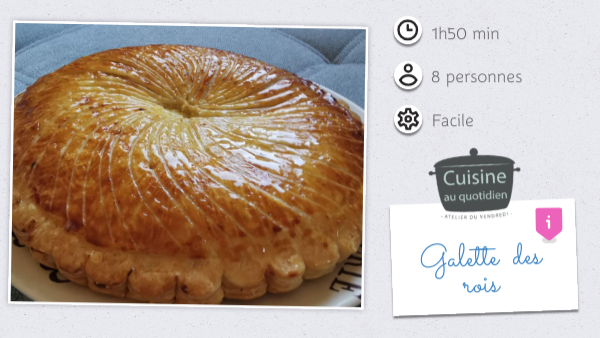 Mettre au four : * 10min à 200°C * 20min à 180°C En attendant, préparez un sirop. Il va donner un bel aspect brillant à votre galette qui sera encore plus jolie ! -> Sirop: dans un écocup, faire chauffer 50g de sucre avec 50g d'eau. Vous n'aurez plus qu'à étaler une fine couche de ce sirop au pinceau dès sa sortie du four.
