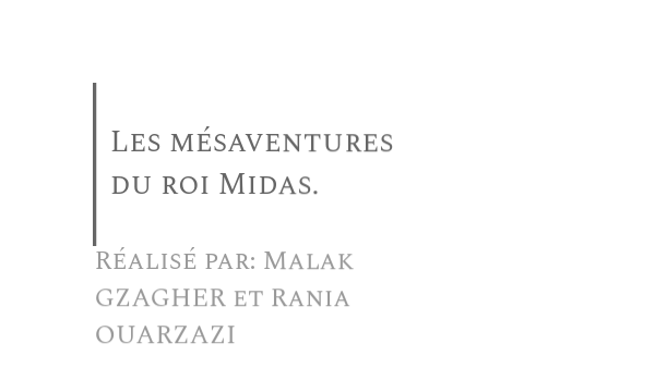 Après avoir fêté silène , l’homme ayant élevé bacchus, Midas le ramène au dieu du vin... Pour le remercier Bacchus lui exauce son veux que tous ce qu’il toucha devint en or . Mais le soir même , Midas n’ayant aucune idée de ce qu’il lui arrivais , il toucha tout le festin de bacchus, bacchus fut alors furieux et lui retira son sort. Quelques jours plus tard ... Midas discuta avec pan qui fut flatté, Pan appelle alors Appollon pour conquérir, Le juge fut le mont tumulus. A la fin du concours , Appollon gagna , Midas l’injura, Apollon fut furieux , il lui Jetta le sort d’avoir des oreilles d’âne