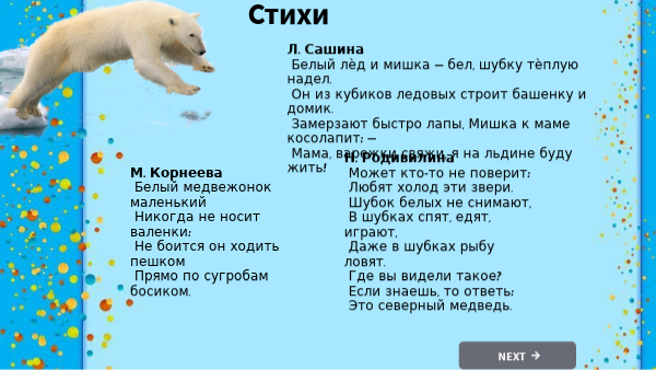Н. Родивилина Может кто-то не поверит: Любят холод эти звери. Шубок белых не снимают, В шубках спят, едят, играют, Даже в шубках рыбу ловят. Где вы видели такое? Если знаешь, то ответь: Это северный медведь.