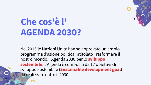 Nel 2015 le Nazioni Unite hanno approvato un ampio programma d’azione politica intitolato Trasformare il nostro mondo: l’Agenda 2030 per lo sviluppo sostenibile. L’Agenda è composta da 17 obiettivi di sviluppo sostenibile (Sustainable development goal) da realizzare entro il 2030.