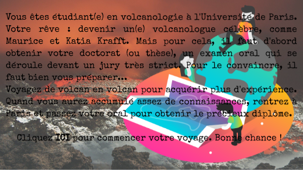 Vous êtes étudiant(e) en volcanologie à l'Université de Paris. Votre rêve : devenir un(e) volcanologue célèbre, comme Maurice et Katia Krafft. Mais pour cela, il faut d'abord obtenir votre doctorat (ou thèse), un examen oral qui se déroule devant un jury très strict. Pour le convaincre, il faut bien vous préparer... Voyagez de volcan en volcan pour acquérir plus d'expérience. Quand vous aurez accumulé assez de connaissances, rentrez à Paris et passez votre oral pour obtenir le précieux diplôme. Cliquez ICI pour commencer votre voyage. Bonne chance !