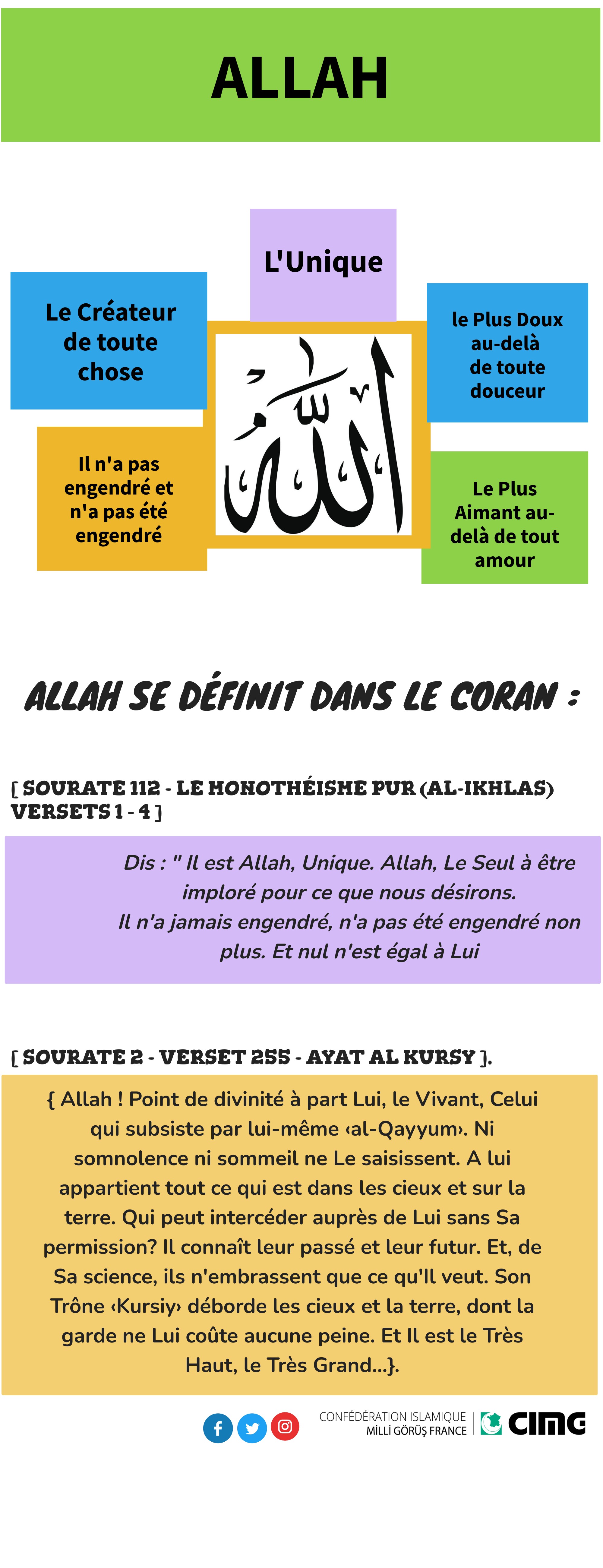 { Allah ! Point de divinité à part Lui, le Vivant, Celui qui subsiste par lui-même ‹al-Qayyum›. Ni somnolence ni sommeil ne Le saisissent. A lui appartient tout ce qui est dans les cieux et sur la terre. Qui peut intercéder auprès de Lui sans Sa permission? Il connaît leur passé et leur futur. Et, de Sa science, ils n'embrassent que ce qu'Il veut. Son Trône ‹Kursiy› déborde les cieux et la terre, dont la garde ne Lui coûte aucune peine. Et Il est le Très Haut, le Très Grand...}.