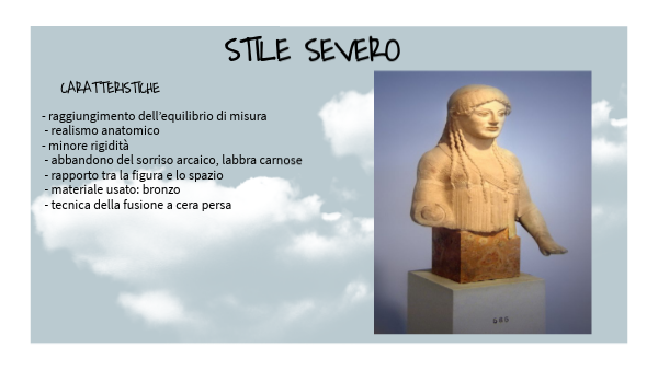 PERCHÈ SI CHIAMA STILE SEVERO? Tra il periodo arcaico e il periodo classico esiste un ventennio circa che porta ad un mutamento dello stile nella statuaria.. Questo periodo si chiama “Periodo severo”, perchè dalle statue scompare il sorriso che aveva caratterizzato le statue del periodo arcaico.