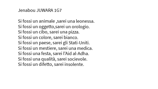 Jenabou JUWARA 1G7 Si fossi un animale ,sarei una leonessa. Si fossi un oggetto,sarei un orologio. Si fossi un cibo, sarei una pizza. Si fossi un colore, sarei bianco. Si fossi un paese, sarei gli Stati-Uniti. Si fossi un mestiere, sarei una medica. Si fossi una festa, sarei l'Aid al-Adha. Si fossi una qualità, sarei socievole. Si fossi un difetto, sarei insolente.