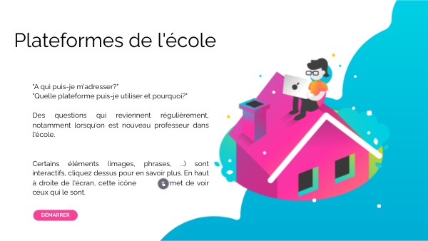 "A qui puis-je m'adresser?" "Quelle plateforme puis-je utiliser et pourquoi?" Des questions qui reviennent régulièrement, notamment lorsqu'on est nouveau professeur dans l'école. Certains éléments (images, phrases, ...) sont interactifs, cliquez dessus pour en savoir plus. En haut à droite de l'écran, cette icône permet de voir ceux qui le sont.