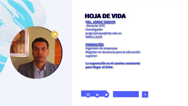 ING. JORGE TAMAYO-Docente ISTE Investigador jorge.tamayo@iste.edu.ec 0995113324 FORMACIÓN Ingeniero de empresas Magister en docencia para la educación superior La superación es el camino constante para llegar al éxito