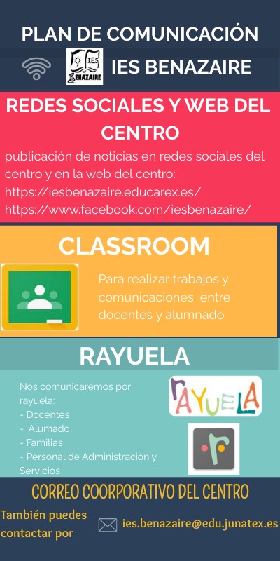publicación de noticias en redes sociales del centro y en la web del centro: https://iesbenazaire.educarex.es/ https://www.facebook.com/iesbenazaire/