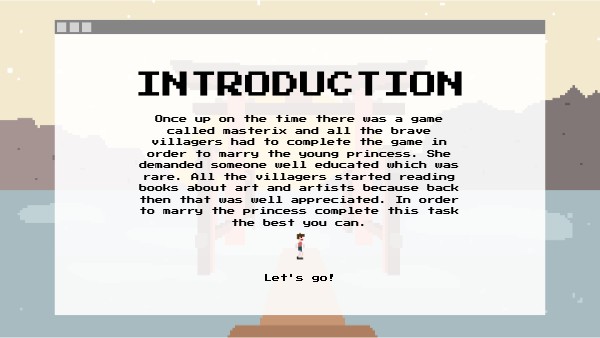 Once up on the time there was a game called masterix and all the brave villagers had to complete the game in order to marry the young princess. She demanded someone well educated which was rare. All the villagers started reading books about art and artists because back then that was well appreciated. In order to marry the princess complete this task the best you can.