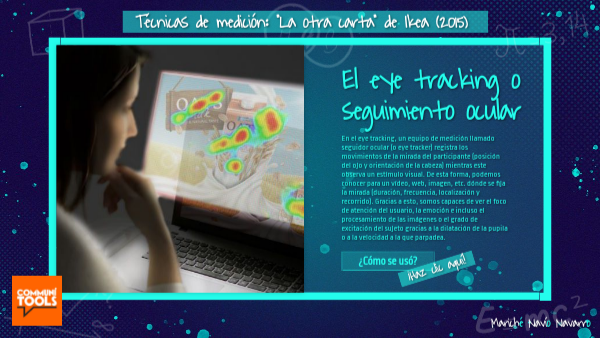 En el eye tracking, un equipo de medición llamado seguidor ocular (o eye tracker) registra los movimientos de la mirada del participante (posición del ojo y orientación de la cabeza) mientras este observa un estímulo visual. De esta forma, podemos conocer para un vídeo, web, imagen, etc. dónde se fija la mirada (duración, frecuencia, localización y recorrido). Gracias a esto, somos capaces de ver el foco de atención del usuario, la emoción e incluso el procesamiento de las imágenes o el grado de excitación del sujeto gracias a la dilatación de la pupila o a la velocidad a la que parpadea.