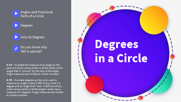 4.7A - Illustrate the measure of an angle as the part of a circle whose center is at the vertex of the angle that is “cut out” by the rays of the angle. Angle measures are limited to whole numbers 4.7B - Illustrate degrees as the units used to measure an angle, where 1/360 of any circle is 1 degree and an angle that “cuts” n/360 out of any circle whose center is at the angle’s vertex has a measure of n degrees. Angle measures are limited to whole numbers.