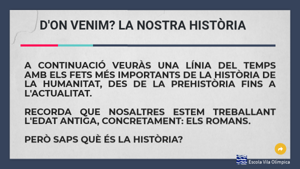 A CONTINUACIÓ VEURÀS UNA LÍNIA DEL TEMPS AMB ELS FETS MÉS IMPORTANTS DE LA HISTÒRIA DE LA HUMANITAT, DES DE LA PREHISTÒRIA FINS A L'ACTUALITAT. rECORDA QUE NOSALTRES ESTEM TREBALLANT L'EDAT ANTIGA, CONCRETAMENT: ELS ROMANS. PERÒ SAPS QUÈ ÉS LA HISTÒRIA?
