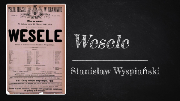 tytuł: "Wesele" autor: Stanisław Wyspiański rodzaj literacki: dramat data pierwszego wystawienia sztuki: 1901 rok czas akcji: noc listopadowa 1900 roku miejsce akcji: bronowicka chata tematyka: narodowa, analiza sytuacji społeczno-politycznej tamtego okresu, krytyka ówczesnego społeczeństwa