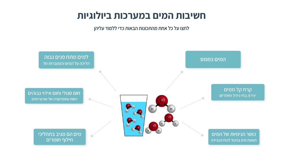 מים יכולים לעבור דרך קרומי תאים באוסמוזה, ולשמור על מאזן מים. ג המים מסייעים בוויסות רמת החומציות בסביבה הפנים־תאית ובאורגניזם השלם.ב