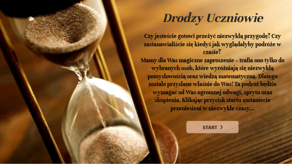 Czy jesteście gotowi przeżyć niezwykłą przygodę? Czy zastanawialiście się kiedyś jak wyglądałyby podróże w czasie? Mamy dla Was magiczne zaproszenie – trafia ono tylko do wybranych osób, które wyróżniają się niezwykłą pomysłowością oraz wiedzą matematyczną. Dlatego zostało przysłane właśnie do Was! Ta podróż będzie wymagać od Was ogromnej odwagi, sprytu oraz skupienia. Klikając przycisk startu zostaniecie przeniesieni w niezwykłe czasy...