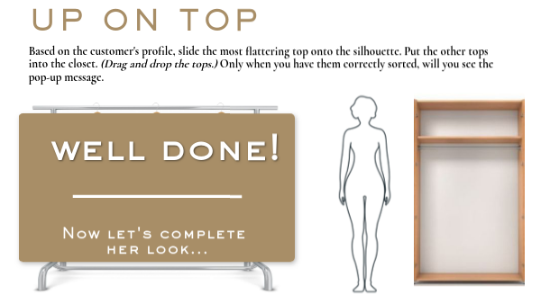 Based on the customer's profile, slide the most flattering top onto the silhouette. Put the other tops into the closet. (Drag and drop the tops.) Only when you have them correctly sorted, will you see the pop-up message.