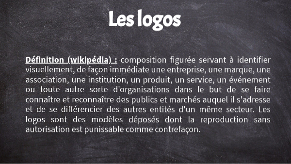 Définition (wikipédia) : composition figurée servant à identifier visuellement, de façon immédiate une entreprise, une marque, une association, une institution, un produit, un service, un événement ou toute autre sorte d'organisations dans le but de se faire connaître et reconnaître des publics et marchés auquel il s'adresse et de se différencier des autres entités d'un même secteur. Les logos sont des modèles déposés dont la reproduction sans autorisation est punissable comme contrefaçon.