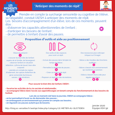 Prendre en compte la surcharge sensorielle ou cognitive de l'élève, sa fatigabilité, conduit l'AESH à anticiper des moments de répit. Les besoins d'accompagnement d'un élève, lors de ces moments, peuvent être : - d'observer les capacités attentionnelles de l'enfant ; - d'anticiper les besoins de l'enfant ; - de permettre à l'enfant d'avoir des pauses.