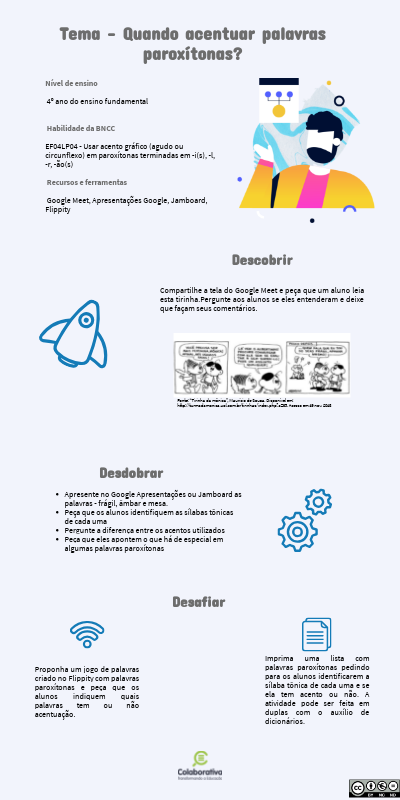 Nível de ensino 4º ano do ensino fundamental Habilidade da BNCC EF04LP04 - Usar acento gráfico (agudo ou circunflexo) em paroxítonas terminadas em -i(s), -l, -r, -ão(s) Recursos e ferramentas Google Meet, Apresentações Google, Jamboard, Flippity
