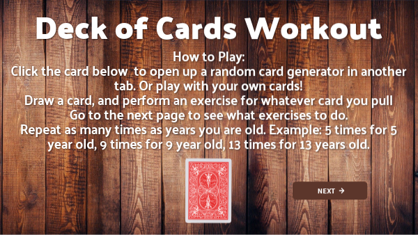 How to Play: Click the card below to open up a random card generator in another tab. Or play with your own cards! Draw a card, and perform an exercise for whatever card you pull Go to the next page to see what exercises to do. Repeat as many times as years you are old. Example: 5 times for 5 year old, 9 times for 9 year old, 13 times for 13 years old.