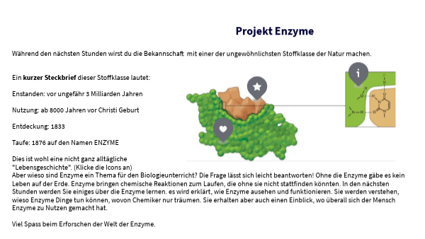 Während den nächsten Stunden wirst du die Bekannschaft mit einer der ungewöhnlichsten Stoffklasse der Natur machen. Ein kurzer Steckbrief dieser Stoffklasse lautet: Enstanden: vor ungefähr 3 Milliarden Jahren Nutzung: ab 8000 Jahren vor Christi Geburt Entdeckung: 1833 Taufe: 1876 auf den Namen ENZYME Dies ist wohl eine nicht ganz alltägliche "Lebensgeschichte". (Klicke die Icons an) Aber wieso sind Enzyme ein Thema für den Biologieunterricht? Die Frage lässt sich leicht beantworten! Ohne die Enzyme gäbe es kein Leben auf der Erde. Enzyme bringen chemische Reaktionen zum Laufen, die ohne sie nicht stattfinden könnten. In den nächsten Stunden werden Sie einiges über die Enzyme lernen. es wird erklärt, wie Enzyme ausehen und funktionieren. Sie werden verstehen, wieso Enzyme Dinge tun können, wovon Chemiker nur träumen. Sie erhalten aber auch einen Einblick, wo überall sich der Mensch Enzyme zu Nutzen gemacht hat. Viel Spass beim Erforschen der Welt der Enzyme.