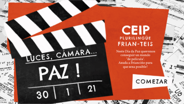 Ola, pequenos e pequenas! Este 30 de xaneiro celebramos o Día Escolar da Non Violencia e da Paz. Todos e todas nós somos protagonistas desta película, así que temos que repasar o guion. Se o facemos ben, poderemos gañar un Premio Goya, ou mesmo un Óscar! É momento de entrar ao cine e, para iso, precisamos mercar as entradas. Imos aló! Luces, cámara...