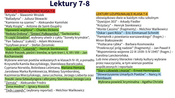 LEKTURY UZUPEŁNIAJĄCE KLASA 7-8 obowiązkowo dwie w każdym roku szkolnym "Dywizjon 303" – Arkady Fiedler "Krzyżacy" – Henryk Sienkiewicz "Monte Cassino" (fragmenty) – Melchior Wańkowicz "Oskar i pani Róża" – Eric-Emmanuel Schmitt "Pamiętnik z powstania warszawskiego" (fragm.) – Miron Białoszewski "Pozłacana rybka" – Barbara Kosmowska "Przekroczyć próg nadziei" (fragmenty) – Jan Paweł II "Wspomnienia wojenne 22 IX 1939–5 IV 1945" (fragm.) – Karolina Lanckorońska. Lub inne utwory literackie i teksty kultury wybrane przez nauczyciela, w tym wiersze poetów współczesnych i reportaże "Stary człowiek i morze" – Ernest Hemingway "Stowarzyszenie Umarłych Poetów" – Nancy H. Kleinbaum Wybrana powieść kryminalna – Agatha Christie