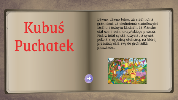 Winnie the Pooh to moje angielskie imię. Książki o moich przygodach zostały przetłumaczone na wiele języków. Dzięki pani Irenie Tuwim, która przetłumaczyła książkę o mnie, zostałem w Polsce Kubusiem Puchatkiem. Ładnie, prawda?