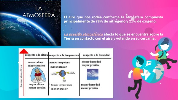 El aire que nos rodea conforma la atmósfera compuesta principalmente de 78% de nitrógeno y 21% de oxígeno. La presión atmosférica afecta lo que se encuentra sobre la Tierra en contacto con el aire y volando en su cercanía.