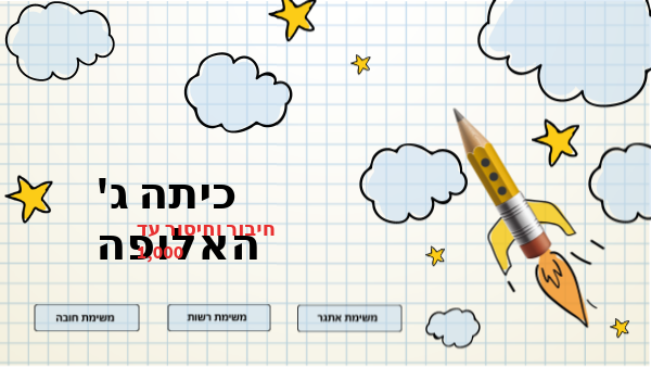 :הַשְׁלִימוּ בַּסֵּפֶר עַמּוּדִים 143 , 144 , 145 .עַמּוּדִים אֵלּוּ הֵם מִבְדַּק .צַלְּמוּ, שִׁלְּחוּ לִי לִבְדִיקָה אַחֲזִיר לָכֶם צִיּוּן+ נְקֻדּוֹת בְּקַלְסְדוֹג'וֹ