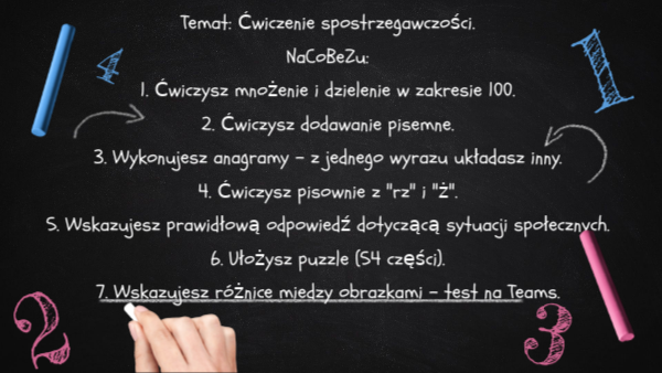 Temat: Ćwiczenie spostrzegawczości. NaCoBeZu: 1. Ćwiczysz mnożenie i dzielenie w zakresie 100. 2. Ćwiczysz dodawanie pisemne. 3. Wykonujesz anagramy - z jednego wyrazu układasz inny. 4. Ćwiczysz pisownie z "rz" i "ż". 5. Wskazujesz prawidłową odpowiedź dotyczącą sytuacji społecznych. 6. Ułożysz puzzle (54 części). 7. Wskazujesz różnice miedzy obrazkami - test na Teams.