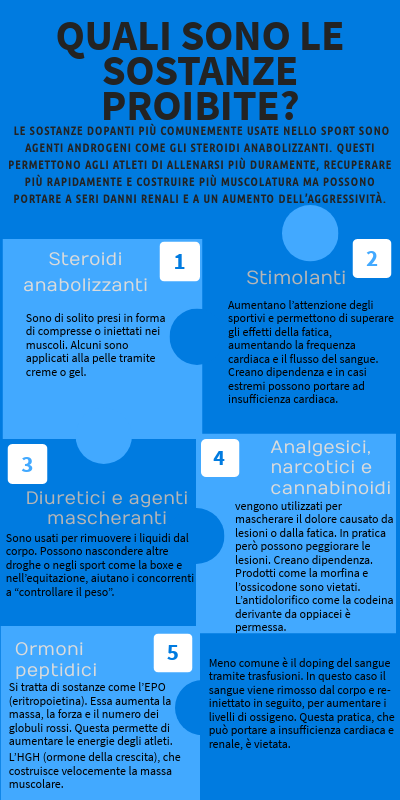 Le sostanze dopanti più comunemente usate nello sport sono agenti androgeni come gli steroidi anabolizzanti. Questi permettono agli atleti di allenarsi più duramente, recuperare più rapidamente e costruire più muscolatura ma possono portare a seri danni renali e a un aumento dell’aggressività.