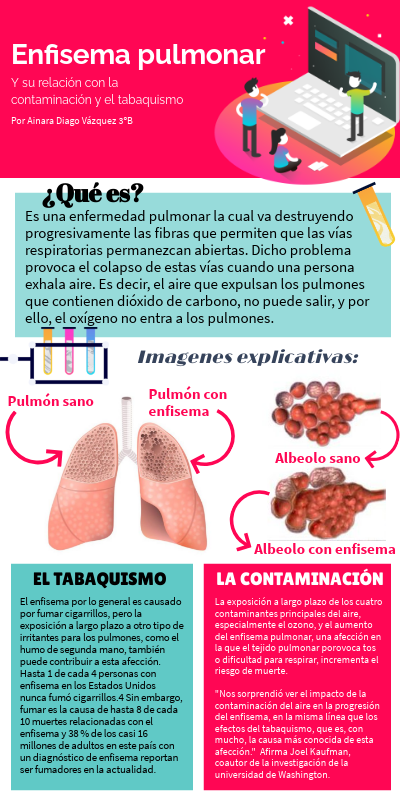 La exposición a largo plazo de los cuatro contaminantes principales del aire, especialmente el ozono, y el aumento del enfisema pulmonar, una afección en la que el tejido pulmonar porovoca tos o dificultad para respirar, incrementa el riesgo de muerte. "Nos sorprendió ver el impacto de la contaminación del aire en la progresión del enfisema, en la misma línea que los efectos del tabaquismo, que es, con mucho, la causa más conocida de esta afección." Afirma Joel Kaufman, coautor de la investigación de la universidad de Washington.