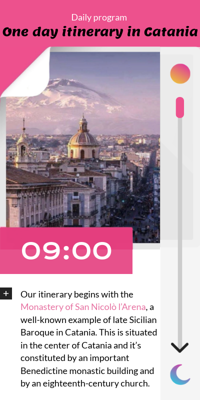 Our itinerary begins with the Monastery of San Nicolò l’Arena, a well-known example of late Sicilian Baroque in Catania. This is situated in the center of Catania and it’s constituted by an important Benedictine monastic building and by an eighteenth-century church.
