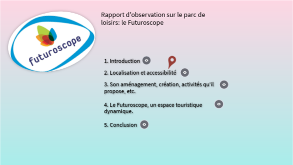 Pendant nôtre semaine d'observation, nous avons fait particulièrement attention à ça : -localisation et son accessibilité -son aménagement, création, activités qu'il propose, etc -et nous avons essayé de montrer qu'il s'agit d'un espace touristique dynamique