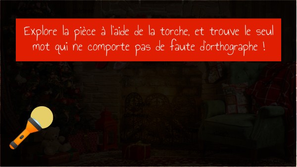 Explore la pièce à l'aide de la torche, et trouve le seul mot qui ne comporte pas de faute d'orthographe !