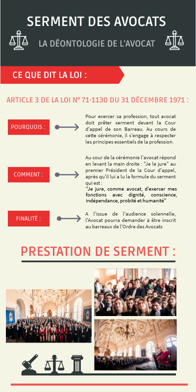 Pour exercer sa profession, tout avocat doit prêter serment devant la Cour d'appel de son Barreau. Au cours de cette cérémonie, il s'engage à respecter les principes essentiels de la profession.