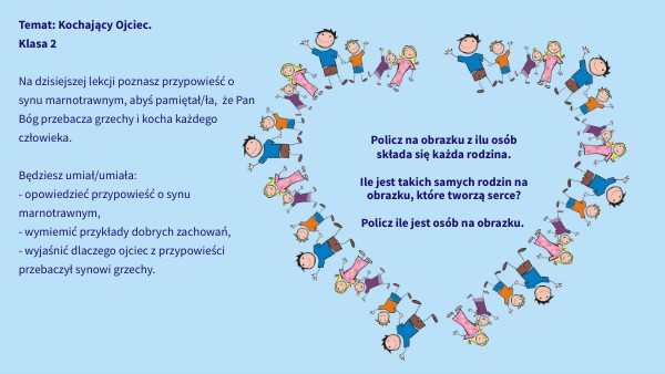Temat: Kochający Ojciec. Klasa 2 Na dzisiejszej lekcji poznasz przypowieść o synu marnotrawnym, abyś pamiętał/ła, że Pan Bóg przebacza grzechy i kocha każdego człowieka. Będziesz umiał/umiała: - opowiedzieć przypowieść o synu marnotrawnym, - wymiemić przykłady dobrych zachowań, - wyjaśnić dlaczego ojciec z przypowieści przebaczył synowi grzechy.