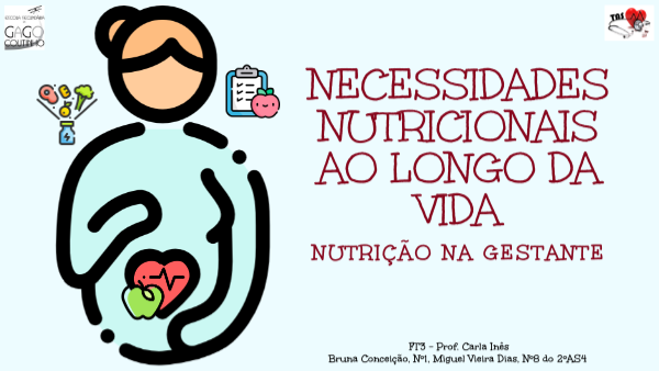 Não há muita variação das necessidades nutricionais em gestantes relativamente a mulheres não gestantes.A alimentação deverá garantir a energia, macronutrientes e micronutrientes, necessários para assegurar todas as transformações orgânicas e funcionais durante esta fase da vida.