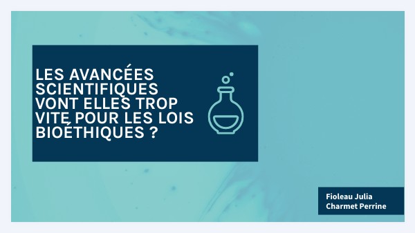 Pour moi, les lois bioéthiques françaises tentent d'évoluer avec les avancées scientifiques et encadrent bien les innovations. Aujourd'hui et dans le futur, les découvertes technologiques vont se succéder très rapidement. C'est pourquoi il faut simplifier la législation bioéthique pour faciliter l'utilisation de découvertes importantes notamment dans le domaine de la médecine. Néanmoins, les lois avancent en même temps que les mentalités et il faut laisser le temps à chacun de réfléchir et se faire un avis sur les progrés des sciences.