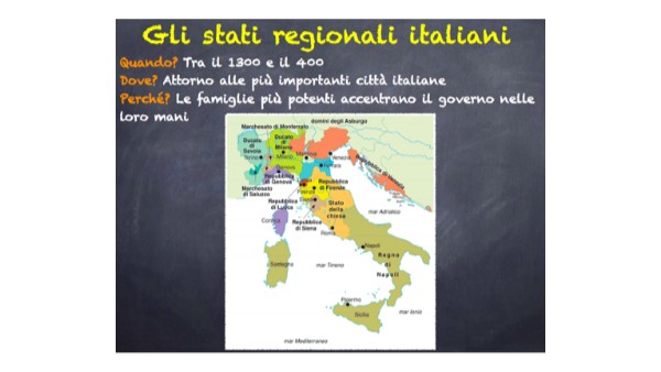 IN ITALIA SI FORMANO VARI STATI REGIONALI Nell’Italia settentrionale e centrale, fra il XIII e il XIV secolo, alcune signorie ottennero il riconoscimento dell’imperatore o del papa, diventando così principati. Signori e principi ingrandirono poi i loro territori trasformandoli in stati regionali, estesi cioè su una o più regioni. In Italia le città furono sempre molto numerose, spesso in conflitto fra loro: perciò non si formò mai un unico stato nazionale comprendente l’intera penisola.