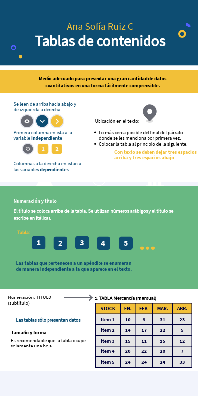 El título se coloca arriba de la tabla. Se utilizan números arábigos y el título se escribe en itálicas.