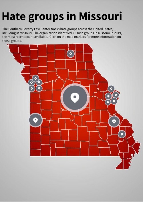 The Southern Poverty Law Center tracks hate groups across the United States, including in Missouri. The organization identified 21 such groups in Missouri in 2019, the most recent count available. Click on the map markers for more information on those groups.