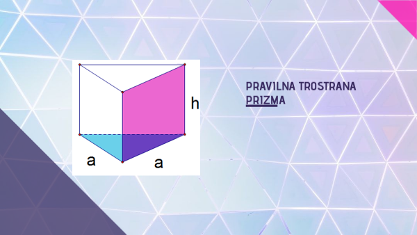 Oplošje pravilne trostrane prizme: O = 2B + P P = 4ah Obujam pravilne trostrane prizme :V = B ∙ h